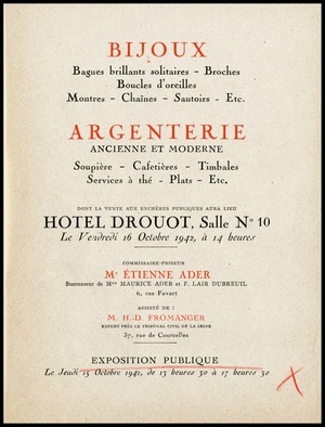 Bijoux : bagues brillants solitaires, broches, boucles d'oreilles, montres, chaînes, sautoires etc : argenterie ancienne et moderne - soupière, cafetières, timbales, services à thé, plats etc. : dont la vente aux enchères publiques aura lieu Hôtel Drouot, Salle No 10, le vendredi 16 octobre 1942 / commissaire-priseur: Étienne Ader, assisté de: H.-D. Fromanger