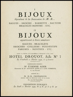 Bijoux : 1, dépendant de la succession de M.R ..., bagues, broche, barrette, sautoir, bracelet-montre, etc., II, appartenant à divers amateurs, bagues, bracelets, broches, colliers, pendentifs, parures, montres etc. : dont la vente aux enchères publiques aura lieu Hôtel Drouot, Salle No 7, le vendredi 12 février 1943 / commissaire-priseur: Étienne Ader, assisté de: H.-D. Fromanger