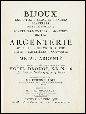 Bijoux, pendentifs, broches, bagues, bracelets, ornés de brillants, bracelets-montres, montres, boîtes : argenterie, soupière, services a thé, plats, cafetières, couverts, métal argenté : dont la vente aux enchères publiques aura lieu Hôtel Drouot, Salle No 10, le jeudi 21 janvier 1943 / commissaire-priseur: Étienne Ader, assisté de: H.-D. Fromanger