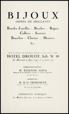 Bijoux ornés de brillants : boucles d'oreilles, broches, bagues, colliers, sautoirs, bracelets, chaînes, montres etc. : dont la vente aux enchères publiques aura lieu à Paris, Hôtel Drouot, Salle No 10, le mercredi 10 juin 1942 / commissaire-priseur: Étienne Ader, assisté de: H.-D. Fromanger