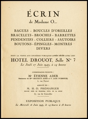 Écrin de Madame O... : bagues, boucles d'oreille, bracelets, broches, barrettes, pendentifs, colliers, sautoirs, boutons, épingles, montres, divers : dont la vente aux enchères publiques aura lieu Hôtel Drouot, Salle No 7, le jeudi 17 juin 1943 / commissaire-priseur: Étienne Ader ; assisté de: H.-D. Fromanger