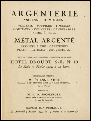 Argenterie ancienne et moderne : platerie, soupière, timbales, goute-vin, couverts, candélabres, jardinières, etc. : métal argenté : services à thé, cafetières, plats, plateuc, couverts etc. : dont la vente aux enchères publiques aura lieu , Salle No 10, le jeudi 10 février 1944 / commissaire-priseur: Étienne Ader, assisté de: H.-D. Fromanger