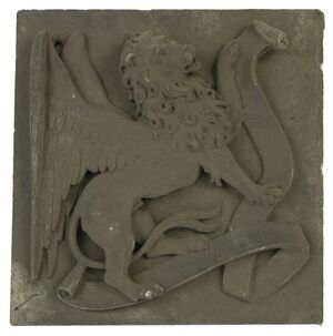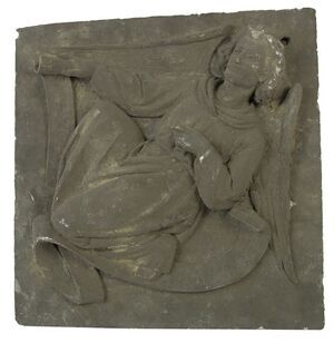 Matthäus als Engel mit Spruchband auf einer trapezförmigen Platte