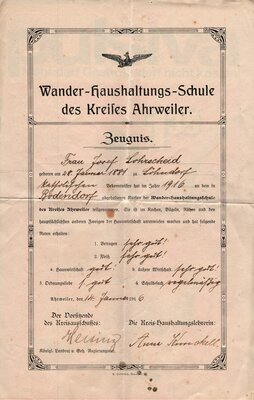 Zeugnis der Wander-Haushaltsschule des Kreises Ahrweiler