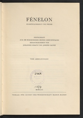 Fénélon : Persönlichkeit und Werk ; Festschrift zur 300. Wiederkehr seines Geburtstages / hrsg. von Johannes Kraus und Joseph Calvet