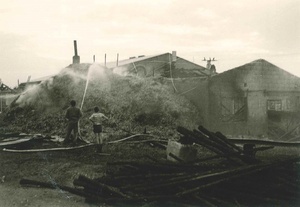 Fabrikruine Bendorf mit qualmendem Schuttberg, eventuell Firma von der Heydt