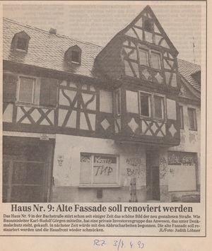 Bachstraße "Haus Nr. 9: Alte Fassade soll renoviert werden", 4. April 1993