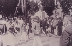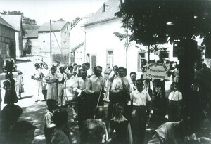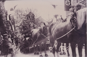 Männergruppe stellte sich für den Festzug zum Oktoberfest 1937 vor Pension Lorscheid auf