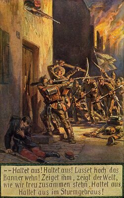 Patriotische Postkarte mit Eisernem Kreuz, Eichenlauf und Durchhalteparole "Fest und Getreu"