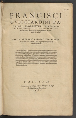Francisci Guicciardini Patricii Florentini Historiarum sui temporis libri viginti / ex Italico in Latinum sermonum nunc primum conversi & editi, Caelio Secvndo Cvrione Interprete.