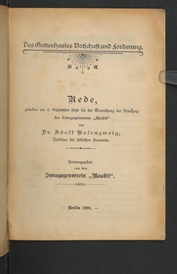 Des Gotteshauses Botschaft und Forderung : Rede, gehalten am 4. September 1898 bei der Einweihung der Synagoge des Synagogenvereins "Moabit" / von Dr. Adolf Rosenzweig (Rabbiner der jüdischen Gemeinde) ; herausgegeben von dem Synagogenverein "Moabit"