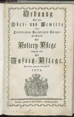 Ordnung Vor die Ober- und Aemtere Des Fürstlichen Hochstifts Speyer In Betref der Policey-Pflege sowohl als der Justitz-Pflege : von dem zweyten des Jahrs 1772