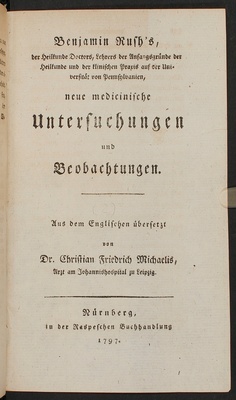 Benjamin Rush's, der Heilkunde Doctors, Lehrers der Anfangsgründe der Heilkunde und der klinischen Praxis auf der Universität von Pennsylvanien, neue medicinische Untersuchungen und Beobachtungen / Aus dem Englischen übersetzt von Dr. Christian Friedrich Michaelis, Arzt am Johannishospital zu Leipzig