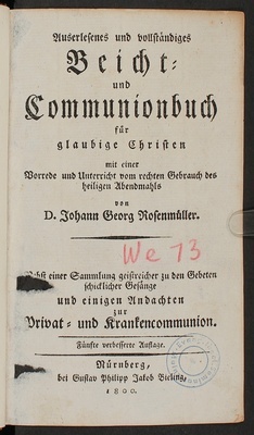 Auserlesenes und vollständiges Beicht- und Communionbuch für glaubige Christen : mit einer Vorrede und Unterricht vom rechten Gebrauch des heiligen Abendmahls ; Nebst einer Sammlung geistreicher zu den Gebeten schicklicher Gesänge und einigen Andachten zur Privat- und Krankencommunion / von D. Johann Georg Rosenmüller