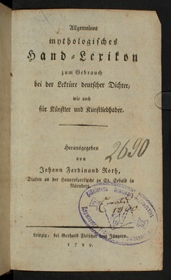 Allgemeines mythologisches Hand-Lexikon zum Gebrauch bei der Lektüre deutscher Dichter, wie auch für Künstler und Kunstliebhaber / Herausgegeben von Johann Ferdinand Roth, Diakon an der Hauptpfarrkirche zu St. Sebald in Nürnberg