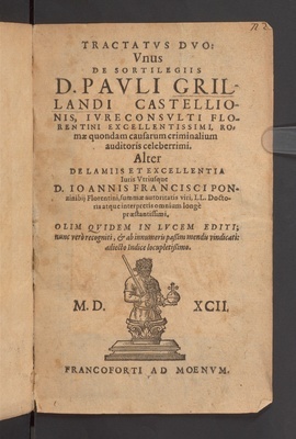 TRACTATVS DVO: Vnus DE SORTILEGIIS D. PAVLI GRILLANDI CASTELLIONIS, IVRECONSVLTI FLORENTINI EXCELLENTISSIMI, ROmae quondam causarum criminalium auditoris celeberrimi. Alter DE LAMIIS ET EXCELLENTIA Iuris Vtriusque D.IOANNIS FRANCISCI PONzinibij Florentini, summae autoritatis viri, LL. Doctoris atque interpretis omnium longè praestantissimi. OLIM QVIDEM IN LVCEM EDITI; nunc verò recogniti, et ab innumeris paßim mendis vindicati: adiecto Indice locupletißimo