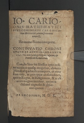 Io. Carionis chronicorum libri tres : continuatio Chronicorum ab anno 1532 ad annum 1547 ; una cum catalogo regnum, caesarum & pontificum Romanorum / in Latinum sermonem converti Hermanno Bonno interprete