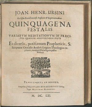 Joan. Henr. Ursini Ecclesiae Ratisbonensis Pastoris & Superintendent. Quinquagena Festalis Variarvm Meditationvm In Praecipua Quaedam Anniversaria Festa : Ex diversis, potissimum Propheticis, S. Scripturae Oraculis Analysi Logico-Theologica explicatis, notisque Philologicis passim illustratis