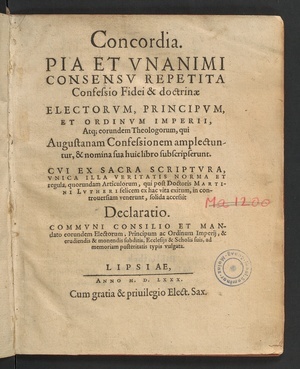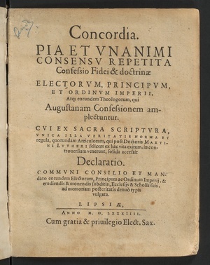 Concordia. PIA ET VNANIMI CONSENSV REPETITA Confessio Fidei & doctrinae ELECTORVM, PRINCIPVM, ET ORDINVM IMPERII. Atq[ue] eorundem Theologorum, qui Augustanam Confessionem amplectuntur, & nomina sua huic libro subscripserunt. ... quorundam Articulorum, qui ... in controuersiam venerunt, solida accessit Declaratio ...