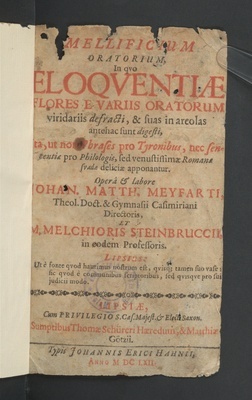 Mellificium oratorium : in quo eloquentiae flores e variis oratorum viridariis defracti, & suas in areolas antehac sunt digesti ... ; operâ & labore / Johan. Matth. Meyfarti, et Melchioris Steinbruccii