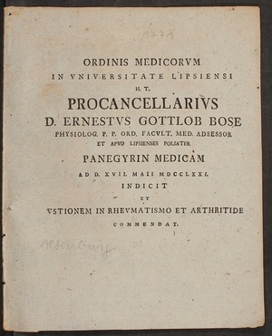 Ordinis Medicorvm in Vniversitate Lipsiensi H. T. Procancellarivs Ernestvs Gottlob Bose, Physiolog. P. P. Ord. Facvlt. Med. Adsessor Et Apvd Lipsienses Poliater Panegyrin Medicam Ad D. XVII. Maii MDCCLXXI. Indicit Et Ustionem In Rhevmatismo Et Arthritide Commendat