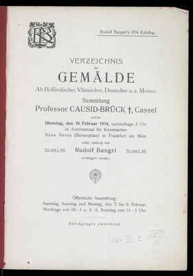 Verzeichnis der Gemälde alt-holländischer, vlämischer, deutscher u.a. Meister : Sammlung Professor Causid-Brück, Cassel, welche Dienstag, den 10. Februar 1914 im Auktionssaal für Kunstsachen Neue Börse in Frankfurt am Main unter Leitung von Rudolf Bangel versteigert wird