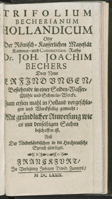 Trifolium Becherianum Hollandicum Oder Der Römisch-Kayserlichen Mayestät Kammer- und Commercien-Raths Dr. Joh. Joachim Bechers Drey Neue Erfjndvngen, Bestehende in einer Seiden-Wasser-Mühle und Schmeltz-Wercke : Zum ersten mahl in Holland vorgeschlagen und Werckstellig gemacht: Mit gründlicher Anweisung wie es mit denselbigen Sachen beschaffen ist ; Auß Der Niederländischen in die Hochteutsche Sprach übersezzet