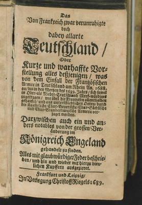 Das Von Frankreich zwar verunruhigte doch dabey allarte Teutschland/ Oder Kurtze und warhaffte Vorstellung alles deßjenigen/ was ... sich sowol in Ober- als Nieder-Teutschland ... Merk-würdiges zugetragen ...