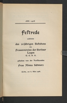 Festrede anlässlich des 20jährigen Bestehens des Frauenvereins der Berliner Logen U. O. B. B. : 1888-1908 / gehalten von der Vorsitzenden Frau Minna Schwarz
