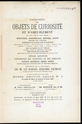 Catalogue des objets de curiosité et d'ameublement des XVIe, XVIIe et XVIIIe siècles : miniatures, bonbonnières, montres, bijoux, objets de vitrine, orfèvrerie de platine, d'or et d'argent, porcelaines et faïences, émaux champlevés, cuirs, armes, clés, verrerie, coffrets, objets variés, étoffes, tapis, jeu de tarot du XVe siècle, ivoires, bois et marbres sculptés, terres cuites par Nini et autres, cires, bronzes d'art et d'ameublement, pendules, sièges, meubles, tapisseries des Flandres et des gobelins, tableaux, aquarelles, dessins, pastels, par Boilly, Coypel, baron Gérard, Hubert-Robert, Mme Vigée-Lebrun, Mignard, etc. dépendant de la succession de M. le baron Jérome Pichon,président honoraire de la Societé des Bibliophiles français et dont la vente aura lieu à Paris, Hôtel Drouot, salle n°1, du lundi 29 mars au samedi 10 avril 1897, à deux heures / commissaire-priseur: Me Paul Chevallier, Experts: MM. Mannheim, père et fils ...