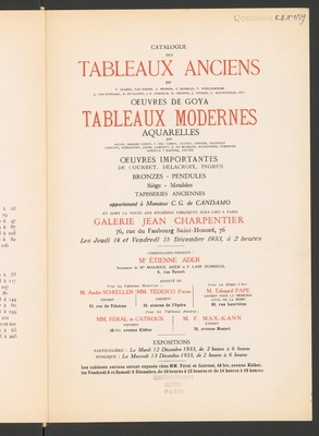 Catalogue des tableaux anciens par F. Guardi ..., œuvres de Goya, tableaux modernes, aquarelles par Arcos ..., œuvres importantes de Courbet, Delacroix, Ingres, bronzes, pendules, siège, meubles, tapisseries anciennes : appartenant à Monsieur C. G. de Candamo et dont la vente ... aura lieu à Paris, Galerie Jean Charpentier, les jeudi 14 et vendredi 15 décembre 1933 / commissaire-priseur Étienne Ader ...