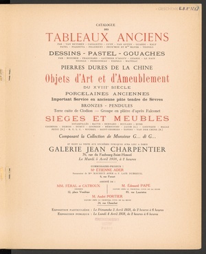 Catalogue des tableaux anciens ..., dessins, pastel, gouaches ..., pierres dures de la Chine, objets d'art et d'ameublement du XVIIIe siècle, porcelaines anciennes, ... composant la collection de monsieur G... di G.. : 5 avril 1938 / Galerie Jean Charpentier, Paris