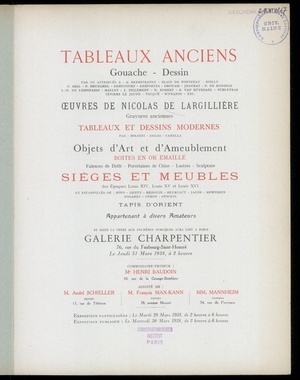 Tableaux anciens : gouache, dessin : par ou attribués à: A. Beerstraten, Blain de Fontenay, Boilly [und weiteren] : œuvres de Nicolas de Largillière : gravures anciennes : tableaux et dessins modernes : par: Boldini, Degas, Canella : objets d'art et d'ameublement : boîtes en or émaillé : faïences de Delft, porcelaines de Chine, lustres, sculpture : sièges et meubles : des époques Louis XIV, Louis XV et Louis XVI : et estampillés de: Bovo, Genty, Hédouin, Heurtaut, Jacob [und weiteren] : tapis d'Orient : appartenant à divers amateurs : et dont la vente aux enchères publiques aura lieu à Paris, Galerie Jean Charpentier, le jeudi 31 mars 1938 / commissaire-priseur: Henri Baudoin ; assisté de: André Schœller, expert, François Max-Kann, expert, MM: Mannheim, experts