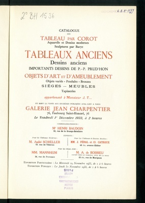 Catalogue des tableau par Corot, aquarelle et dessins modernes, sculptures par Barye, tableaux anciens, dessins anciens, importants dessins de P.-P. Prud'hon, objets d'art et d'ameublement, objets variés, pendules, bronzes ... appartenant à monsieur J.T... ; et dont la vente ...a Paris Galerie Jean Charpentier ... le vendredi 1er Décembre 1933, à 2 heures