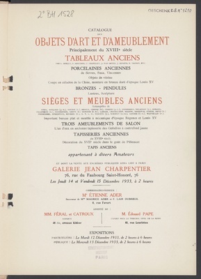 Catalogue des objets d'art et d'ameublement principalement du XVIIIe siècle ; tableaux anciens ... ; porcelaines anciennes ... ; bronzes, pendules ... ; et dont la vente aux enchères publiques aura lieu à Paris, Galerie Jean Charpentier, le jeudi 14 Décembre et vendredi 15 Décembre 1933 / Commissaire-Priseur: Me Étienne Ader