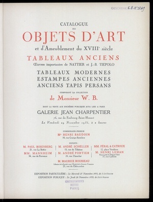 Catalogue des objets d'art et d'ameublement du XVIIIe siècle : tableaux anciens : œuvres importantes de Nattier et J.-B. Tiepolo : tableaux modernes : estampes anciennes : anciens tapis persans : composant la Collection de Monsieur W.B. : dont la vente aux enchères publiques aura lieu à Paris, Galerie Jean Charpentier, le vendredi 29 novembre 1935 / commissaire-priseur: Henri Baudoin ; experts: Paul Rosenberg, André Schœller,MM. Féral & Catroux, MM. Mannheim, André Portier, Henri Leman, Maurice Rousseau