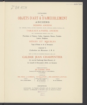 Catalogue des objets d'art et d'ameublement anciens, dessins anciens par Boucher, Coypel, De Troy ... [et al.], tableaux et pastels anciens ..., porcelaines et faïences ..., sièges et meubles ..., composant la collection de monsieur J.A.S. ; dont la vente aux enchères publiques aura lieu Galerie Jean Charpentier ... le lundi 11 décembre 1933, à 2 heures