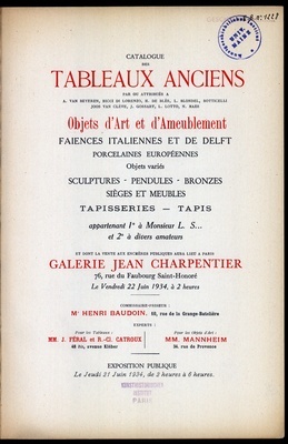 Catalogue des tableaux anciens : par ou attribués à A. van Beyeren, Bicci di Lorenzo, H. de Blès, L. Blondel [und weiteren] : objets d'art et d'ameublement : faïences italiennes et de Delft : porcelaines européennes : objets variés : sculptures, pendules, bronzes : sièges et meubles : tapisseries, tapis : appartenant 1. à Monsieur L. S.... et 2. à divers amateurs : et dont la vente aux enchères publiques aura lieu à Paris, Galerie Jean Charpentier, le vendredi 22 juin 1934 / commissaire-priseur: Henri Baudoin ; experts: Pour les tableaux: J. Féral et R.-CL. Catroux, pour les objets d'art MM: Mannheim