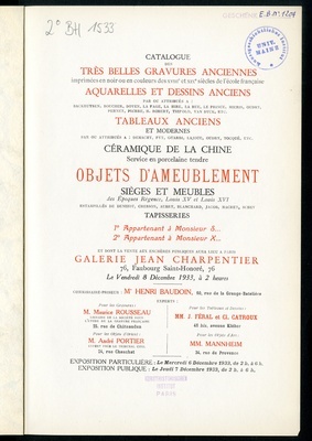 Catalogue des très belles gravures anciennes ... aquarelles et dessins anciens ... tableaux anciens ... objets d'ameublement ...: et dont la vente aux enchères publiques aur lieu a Paris Galerie Jean Charpentier ... le vendredi 8 Décembre 1933, à 2 heures