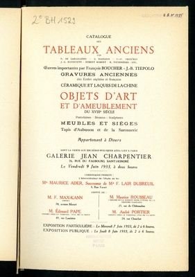 Catalogue des tableaux anciens, œuvres importantes par François Boucher, J.-B. Tiepolo, gravures anciennes des Écoles anglaise et française, céramique et laques de la Chine, objets d'art et d'ameublement du XVIIIe siècle,.. : 9 juin 1933 / Galerie Jean Charpentier, Paris