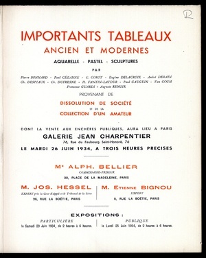 Importants tableaux : ancien et modernes : aquarelle, pastel, sculptures : par Pierre Bonnard, Paul Cézanne, C. Corot, Eugène Delacroix, André Derain [und weitere] : provenant de dissolution de Société et de la Collection d'un amateur : dont la vente aux enchères publiques, aura lieu à Paris, Galerie Jean Charpentier, le mardi 26 juin 1934 / Alph. Bellier, commissaire-priseur ; Jos. Hessel, expert près la Cour d'Appel et le Tribunal de la Seine, Ètienne Bignou, expert