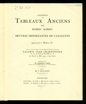 Catalogue des tableaux anciens par Hubert Robert ; oeuvres importantes de Canaletto appartenant à Madame D ... dont la vente a Paris, aux enchères publiques, aura lieu Galerie Jean Charpentier, 14 Mai 1934. Expositions 12-13 Mai, 1934