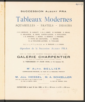 Succession Albert Pra : Tableaux modernes, aquarelles, pastels, dessins par J.-B. Carpeaux, M. Cassatt, J.-B.-C. Corot ..., sculptures par A. Maillol et A. Rodin, dépendant de la succession Albert Pra, dont la vente ... aura lieu à Paris, Galerie Charpentier, le vendredi 17 juin 1938 / Alph. Bellier, commissaire-priseur ...