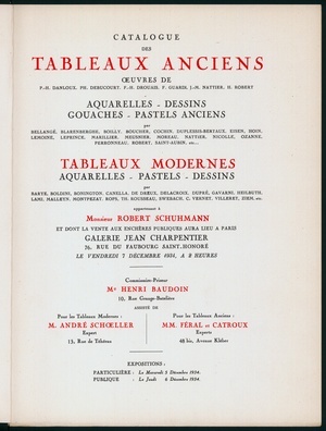 Catalogue des tableaux anciens ..., aquarelles, dessins, gouaches, pastels anciens, tableaux modernes ..., appartenant à Monsieur Robert Schuhmann et dont la vente ... aura lieu à Paris, Galerie Jean Charpentier, le vendredi 7 décembre 1934 / commisaire-priseur Henri Baudoin ...