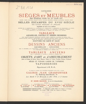 Catalogue des Sièges et Meubles des époques Louis XV et Louis XVI. Belles estampes du XVIIIe siècle des Ecoles Française et Anglaise, tableaux, aquarelles, etc : Vente à Paris, Galerie Jean Charpentier, les 8 et 9 Mai 1934.