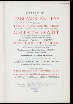 Catalogue des tableaux anciens : par Drouais, Füger, Lawrence, Leclerc, Le Prince, Miéris [und weitere] : tableaux et pastels modernes : par Boldini, Bonnard, Corot, Degas, Forain [und weitere] : objets d'art et d'ameublement du XVIIIe siècle : anciennes porcelaines de Chine : bronzes, pendules, argenterie : meubles et sièges : plusieurs estampillés de: Boudin, Boulard, Délannois, Jacon, Lélarge, Oeben : grand bureau d'époque Louis XIV : tapisserie de Beauvais d'après Boucher : tapisserie d'après Teniers : appartenant à divers amateurs : et dont la vente aux enchères publiques aura lieu à Paris, Galerie Georges Petit, 8, rue de Sèze, le vendredi 27 mail 1932 / commissaire-priseur: Maurice Ader, successeur de F. Lair Dubreuil ; assisté de MM. Féral et Catroux, experts, A. Schœller, expert, G. B.-Lasquin, expert, Édouard Pape, expert près le Tribunal civil