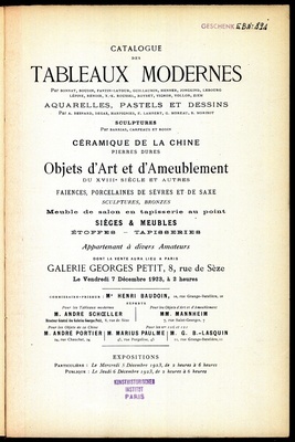 Catalogue des tableaux modernes : par Bonnat, Boudin, Fantin-Latour, Guillaumin, Henner, Jongkind, Lebourg [und weitere] : aquarelles, pastels et dessins : par A. Besnard, Degas, Harpignies, E. Lambert, G. Moreau, B. Morisot : sculptures par Barrias, Carpeaux et Rodin : céramique de la Chine : pierres dures : objets d'art et d'ameublement du XVIIIe siècle et autres : faïences, porcelaines de Sèvres et de Saxe : sculptures, bronzes : meuble de salon en tapisserie au point : sièges & meubles : étoffes, tapisseries : appartenant à divers amateurs : dont la vente aura lieu à Paris, Galerie Georges Petit, 8, rue de Sèze, le vendredi 7 décembre 1923 / commissaire-priseur: Henri Baudoin ; experts pour les tableaux modernes: André Schœller, pour les objets d'art et d'ameublement MM. Mannheim, pour les objets de la Chine André Portier, pour les nos 106 et 121 Marius Paulme, G. B.-Lasquin