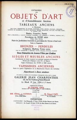 Catalogue des objets d'art et d'ameublement anciens : tableaux anciens et modernes : par Aved, Berkheyde, de Marne, Duplessis, Huet, Ingres, Jeaurat [und weitere] : dessins, gouaches, pastels : par L. Belanger, J. Callot, Rosalba, Carriera [und weitere] : porcelaines du XVIIIe siècle : Chine, Saxe, Sèvres : paire de jardinières éventails en porcelaine de Sèvres à fond vert : ivoire et argenterie : bronzes, pendules : sculptures, marbres, terres cuites : par ou attribués à Chinard, Pajou, Roland, Houdon, Clodion : deux statuettes de jeunes filles par Clodion : sièges et meubles anciens : ameublement de salon recouvert en ancienne tapisserie de Beauvais, bureau plat d'Époque Louis XV, de Migeon, tapis d'Aubusson des XVIIIe et XIXe siècles : tapisseries anciennes : suite de quatre tapisseries de la Manufacture Royale des Gobelins : appartenant à divers amateurs : et dont la vente aux enchères publiques aura lieu à Paris, Galerie Jean Charpentier, le mardi 19 juin 1934 / commissaire-priseur: Étienne Ader, successeur de Maurice Ader et F. Lair Dubreuil ; assisté de: MM. Féral et Catroux, experts, Édouard Pape, expert près le Tribunal civil de la Seine
