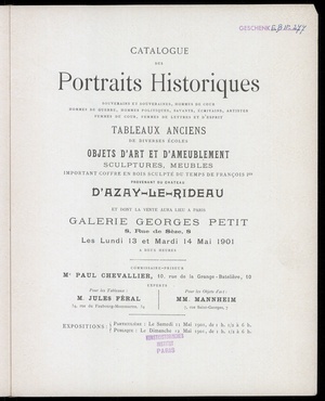 Catalogue des portraits historiques : souverains et souveraines, hommes de cour, hommes de guerre, hommes politiques, savants, écrivains, artistes, femmes de cour, femmes de lettres et d'esprit : tableaux anciens : de diverses Écoles : objets d'art et d'ameublement : sculptures, meubles : important coffre en bois sculpté du temps François Ier : provenant du Château d'Azay-le-Rideau : et dont la vente aura lieu à Paris, Galerie Georges Petit, 8, rue de Sèze, les lundi 13 et mardi 14 mai 1901 / commissaire-priseur Paul Chevallier ; experts pour les tableaux: Jules Féral, pour les objets d'art: MM. Mannheim