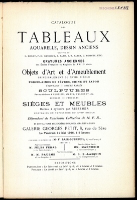 Catalogue des tableaux : aquarelle, dessin anciens : œuvres de L. Boilly, P.-H. Danloux, A. Paris, J.-B. Pater, G. Romney, etc. : gravures anciennes des Écoles française et anglaise du XVIIIe siècle : objets d'art et d'ameublement principalement du XVIIIe siècle : porcelaines de Sèvres, Chine et Japon : éventails, objets variés : sculptures : par ou attribués à Clodion, Marin, Falconet etc. : bronzes, pendules : sièges et meubles : bureau à cylindre par Riesener : portraits en tapisserie du XVIIe siècle : dépendant de l'ancienne Collection de M. F. B... : et dont la vente aux enchères publiques aura lieu à Paris, Galerie Georges Petit, 8, rue de Sèze, le vendredi 21 mai 1926 / commissaire-priseur: F. Lair Dubreuil ; experts: Pour les tableaux: Jules Féral, pour les objets d'art: MM. Mannheim, pour les gravures: M. Paulme, G. B.-Lasquin